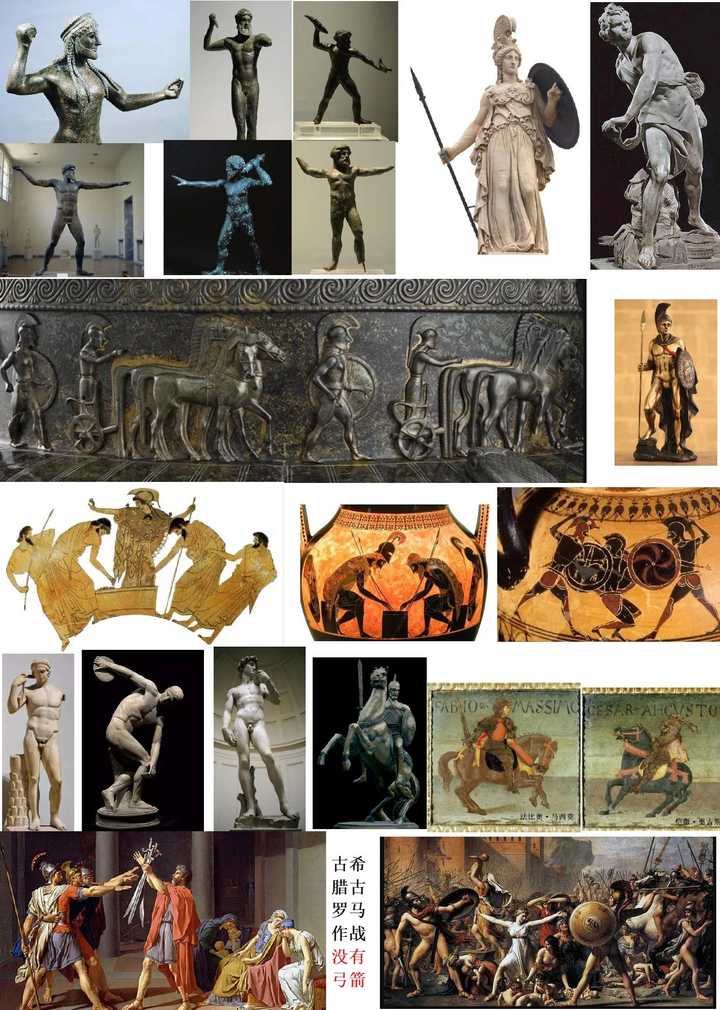 从这些古希腊罗马的作战图看,在欧洲人心目中,古希腊罗马是没有弓箭的,至少弓箭在战场上的作用是很小的: |