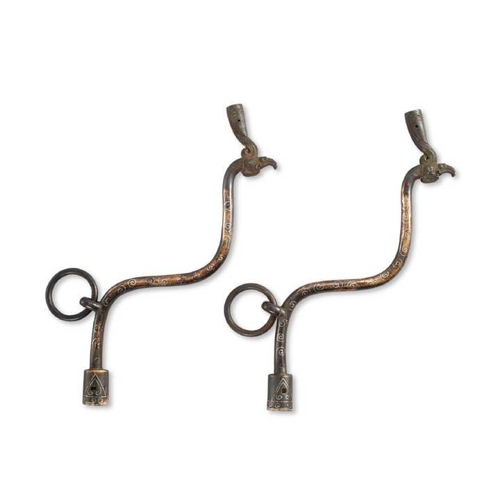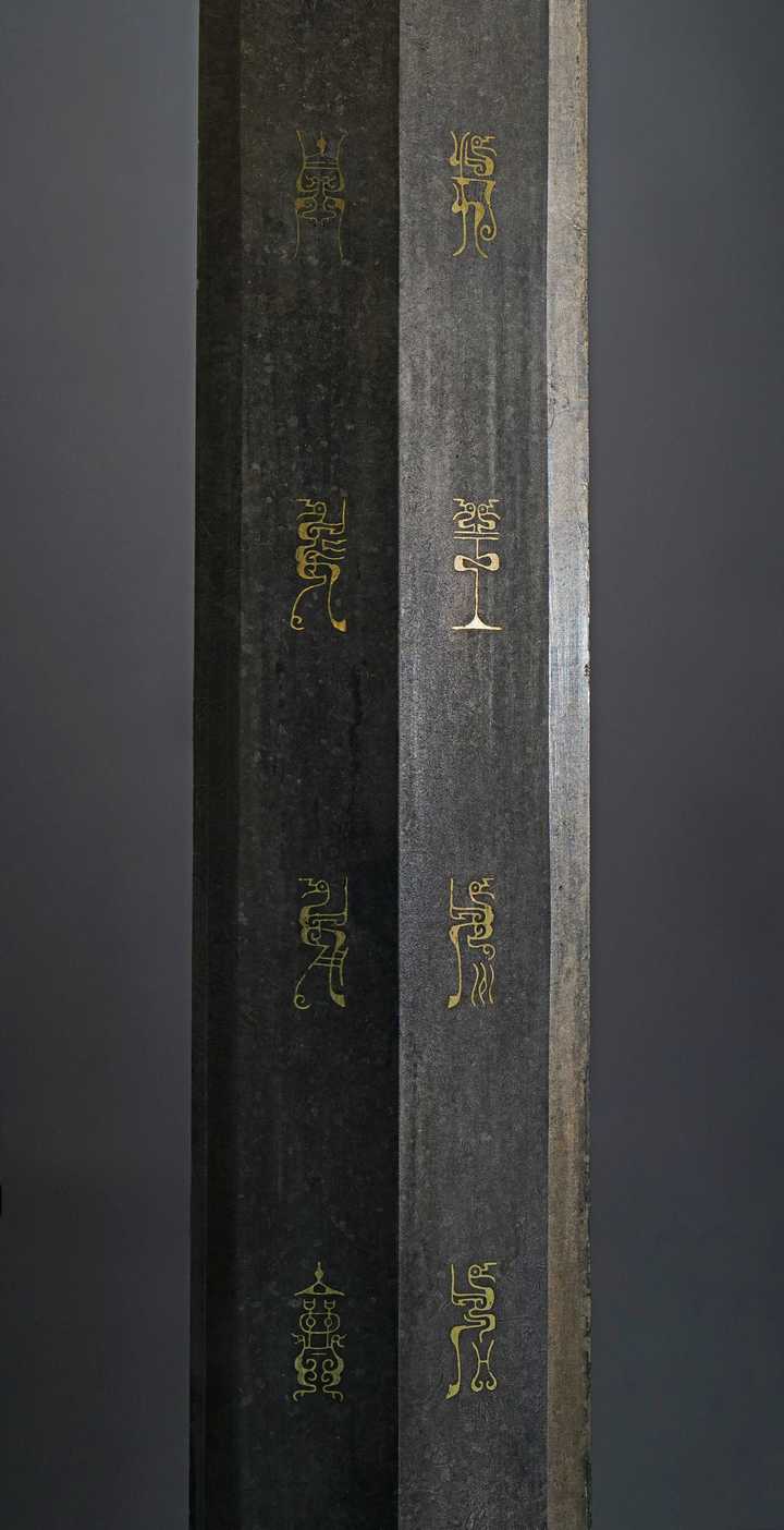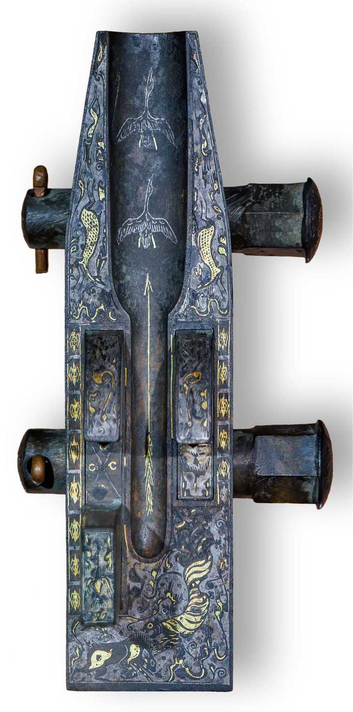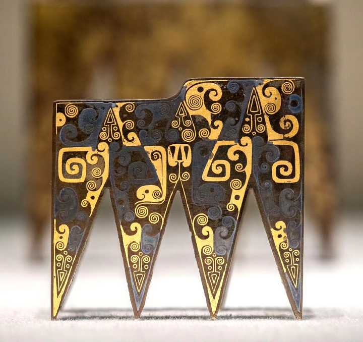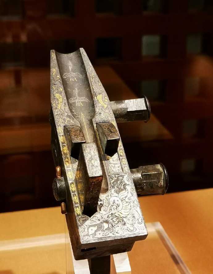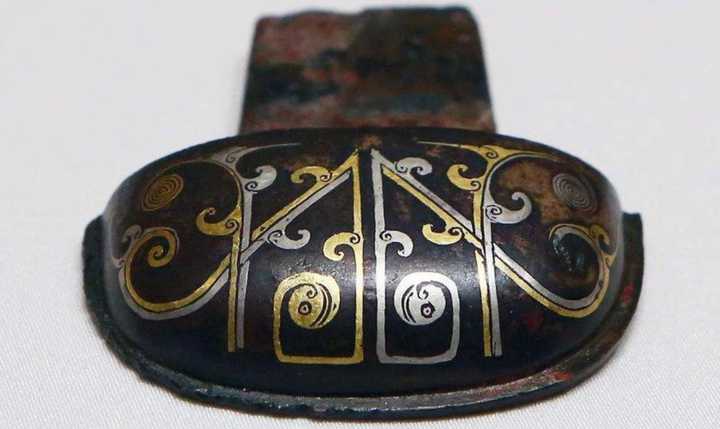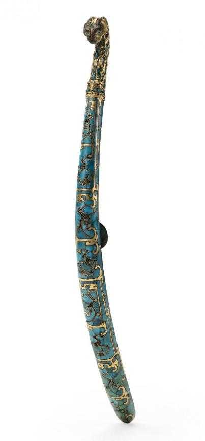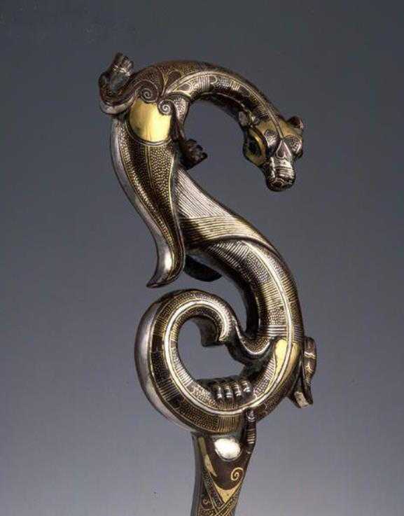 【西汉早期错金银铜剑柄】西汉早期错金银云气镂神兽纹铜剑柄。铸铜骨剑柄,错金银流云纹饰,一双角神兽盘桓其中。铁剑剑身已朽,空留铜柄神器 |