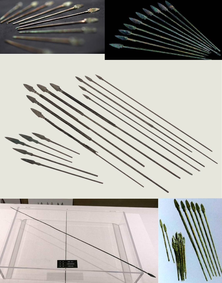 不但有弓箭,还有很多种,打仗的,打猎的都有不一样的标准要求: 《考工记》说,“矢人为矢:鍭矢,三分。茀矢,三分,一在前,二在后。兵矢、田矢,五分,二在前,三在后。杀矢,七分,三在前,四在后。 杀矢“刃长寸,围寸,铤十之,重三垸。”中的“铤十之”有什么玄妙呢? 铤的就是箭头后面细长金属杆部分,铤是插在箭杆里,固定箭头,并提高头部强度。而杀矢这种超长铤显然是为了提高整体重量,以提升近距离杀伤力,起到配重芯的作用。可能有人会问,要增加重量为什么不加大箭头或在箭尾加配重?加大箭头会提高风阻和风偏,导致箭重心过度靠前影响箭的飞行姿态。并且穿芯的长铤能提高箭体挠度(刚性)和强度,比在箭尾加配重有更多好处。 看看这些杀矢 |