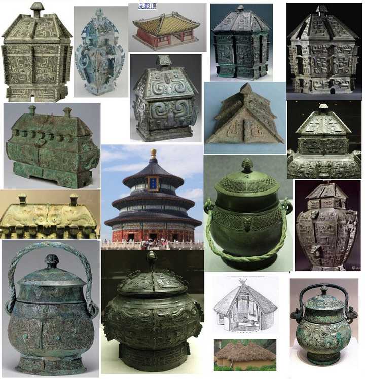 从文物中可以得到很多历史信息,比如三千多年前的建筑造型,可以从商周青铜器上得知大概: |