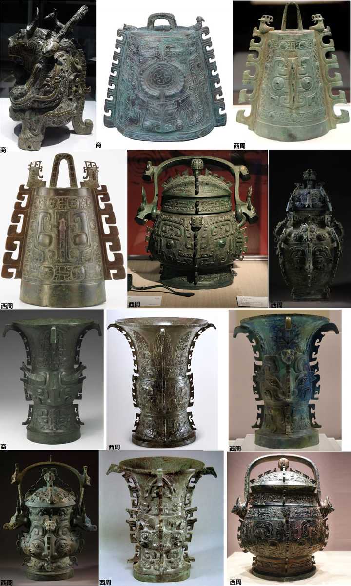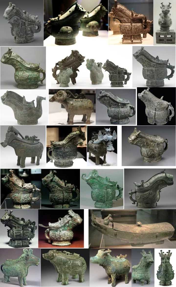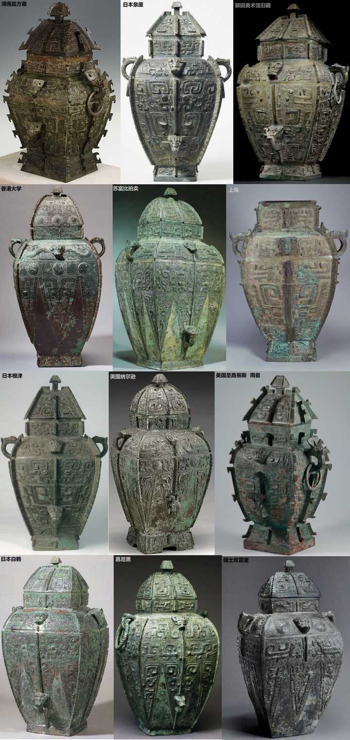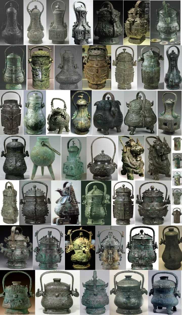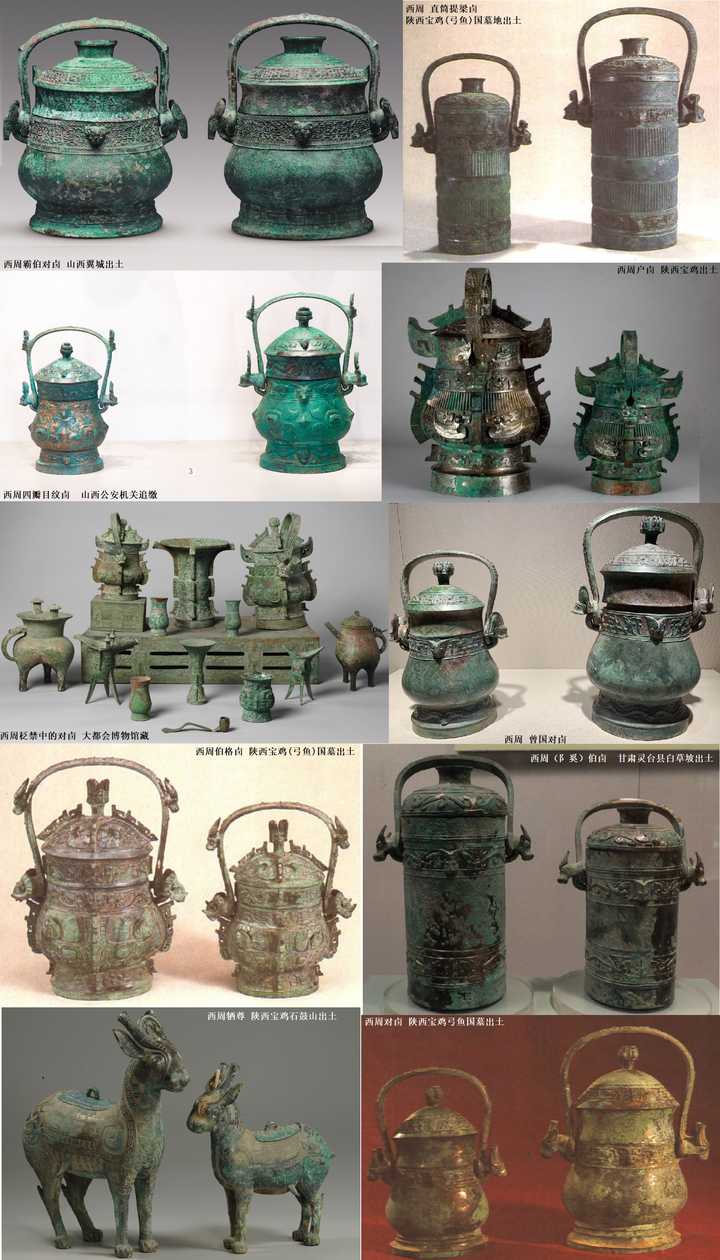 一组对器,主要是西周时期的对卣,造型纹饰一致,大小约为三比二 |
