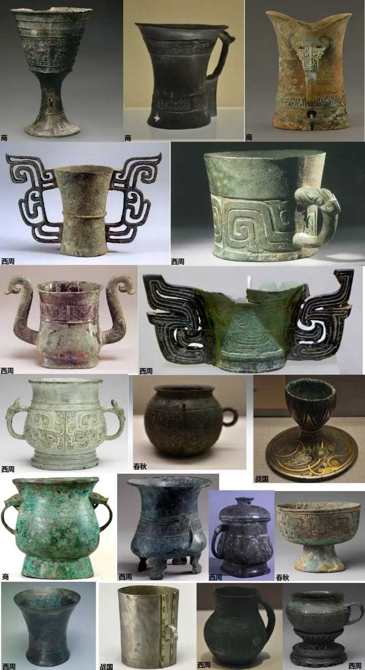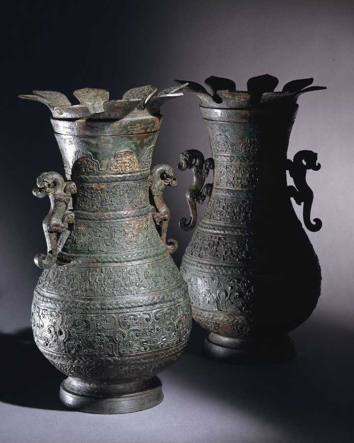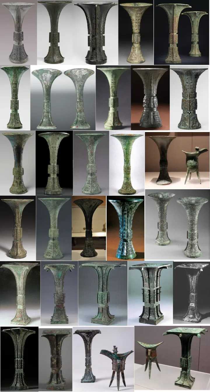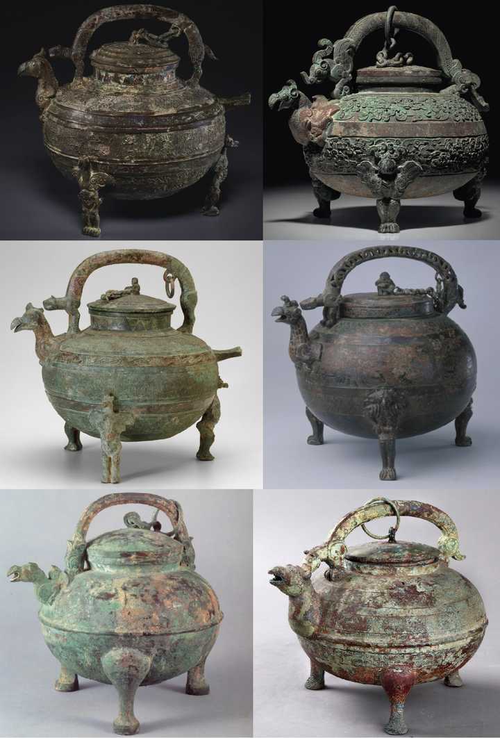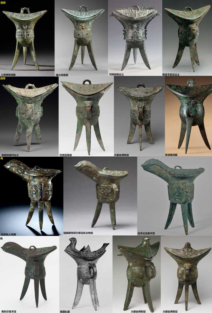 一组对器,主要是西周时期的对卣,造型纹饰一致,大小约为三比二 |