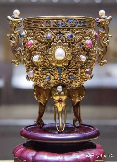 中国古代文物,很多时候背后的文化价值要大于艺术和工艺价值。比如去年大英博物馆展出了“金瓯永固杯”,这是从圆明园盗取的国宝级文物了。如果纯粹以珠宝镶嵌的美学角度看,其工艺远称不上惊艳,掐丝珐琅工艺,采用了包镶的手法,严重了限制光线进入宝石的路径,减少了宝石的闪耀度。宝石甚至就是原石,没有经过任何的抛光,只是打磨了下形状。 |