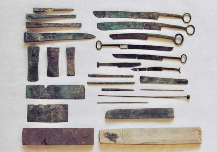 迄今所见最为齐全的春秋书刻工具, 1978年山东滕州薛国故城2号墓出土。 共计27件,种类有铜斧、锛、削刀、刻刀、凿、刻针、锯、钻、磨石等。猜原有毛笔,可能已朽毁。包括了从破竹、修正到刻字、改错组装以及磨砺工具,为研究春秋书刻用具提供了一套完整的实物资料。 ??? |