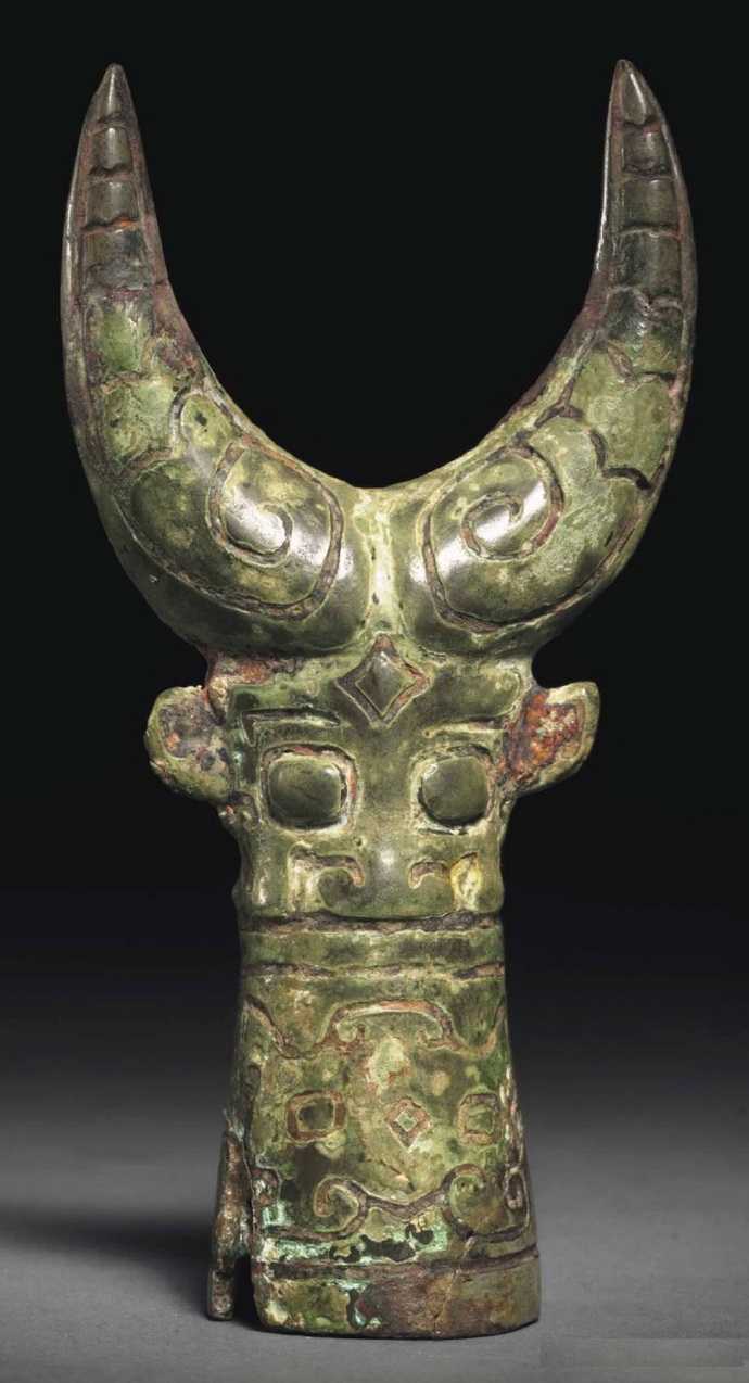哈里斯藏商时期的权杖首,有标准化饕餮和牛首,即是北斗和北极星的组合,以之为权杖图像,权执者若呼应北极星 |