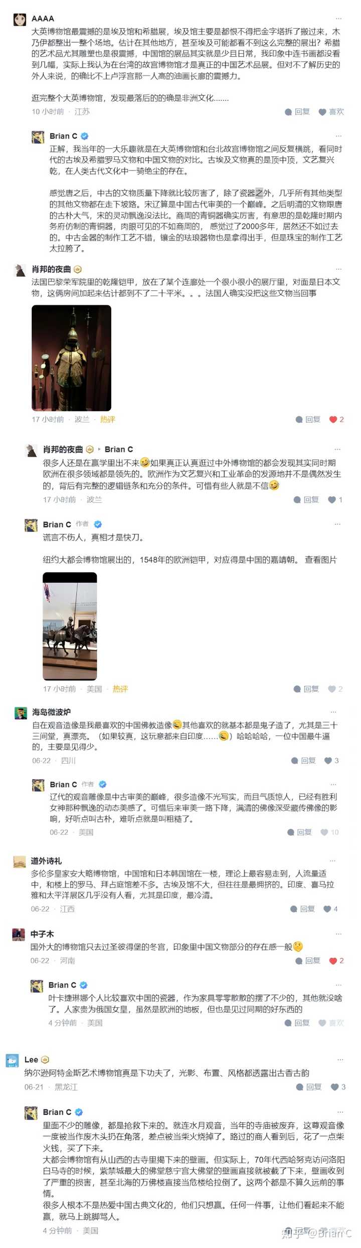 旅行过快二十个国家,欧洲去过七八次的人,认认真真告诉你“并没有”,欧洲的博物馆更加热衷收藏自己本土的艺术品,意大利最喜欢收藏文艺复兴三杰,从罗马到佛罗伦萨到那不勒斯,意大利任何城市的美术馆博物馆都以收藏几件达芬奇拉斐尔米开朗基罗为荣,没有这三位的作品撑门面,都不好意思开张。 法国我只去了卢浮宫和凡尔赛宫,基本都是欧洲本土的艺术品,欧洲以外的很少,根本也没看见中国文物在哪。 马德里和巴塞罗那喜欢拿毕加索和高迪做文章,人家不太认得中国文物是啥。 如果收藏欧洲以外的文物艺术品,那也是埃及,奥斯曼帝国,巴比伦的文物优先。 譬如德国的柏林博物馆岛,他家的佩加蒙博物馆,收藏了一整个巨大的宙斯神庙,从土耳其的佩加蒙古城挖过来的。 还有整面墙的巴比伦城门,这些尼布甲尼撒时代的琉璃瓦在21世纪依然布灵布灵,拼出狮子和其他各种动物的浮雕,,从伊拉克地界上挖的。 |