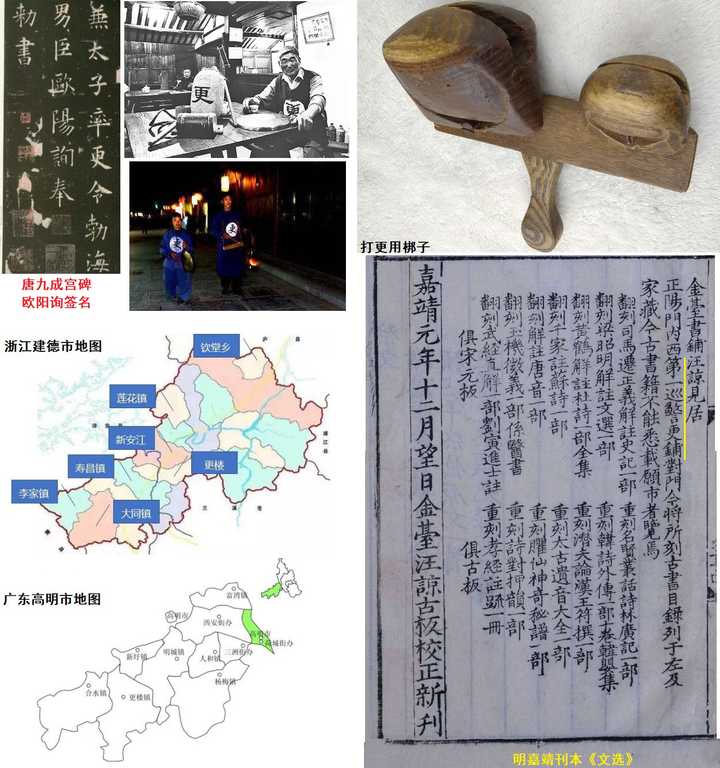 除了钟楼鼓楼,所谓晨钟暮鼓,夜里则有更夫报时。最早的更夫可以追溯到西周,当时叫鸡人。 《周礼·春官·鸡人》:“鸡人掌共鸡牲,辨其物。大祭祀,夜嘑旦以嘂(叫)百官。凡国之大宾客、会同、军旅、丧纪,亦如之。凡国事为期,则告之时。凡祭祀,面禳衅,共其鸡牲。” 秦置率更令,汉因之。为太子属官,掌漏刻。晋主宫殿门户及赏罚之事,职如光禄勋﹑卫尉。隋掌伎乐漏刻。唐称率更寺令,加掌皇族次序及刑法事。 李商隐《马嵬》诗:“空闻虎旅传宵柝,无复鸡人报晓筹。” 更夫除了报时还兼有巡逻职责,明朝的时候已经有巡警之称,明嘉靖刊本《文选》后面书家广告有“第一巡警更铺”的名称。 打更的驻地叫更楼,有些地方至今还有更楼的地名,比如浙江建德的更楼街道,广东高明的更楼镇。 |