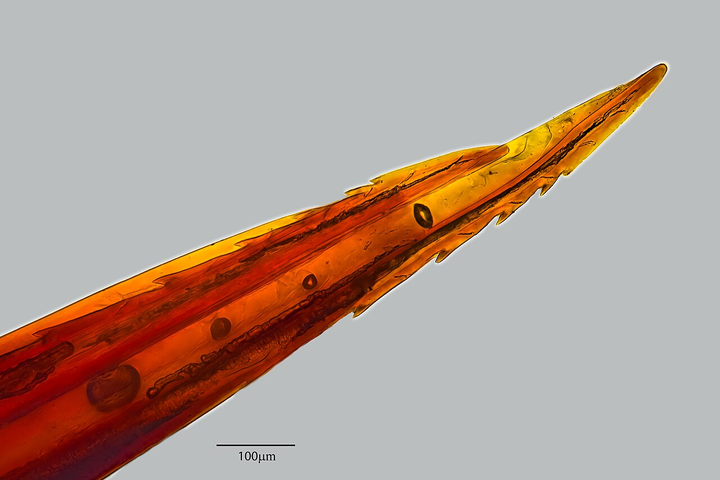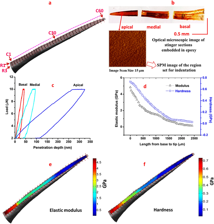 虎头蜂刺针的生物力学属性 虎头蜂尾针可达6mm[6],能轻松刺穿人类脆弱的皮肤。 人类的皮肤,是所有动物中最薄的那一档。即便是最厚的手掌和脚掌,也仅仅只有4mm,面部皮肤厚度低于1.5mm,其中最薄的眼睑周围,仅仅只有0.5mm。 黄蜂在把尾针刺入人类皮肤时,还会专门找一个合适的角度,使得尾针受到最小的应力和应变[7]。 |