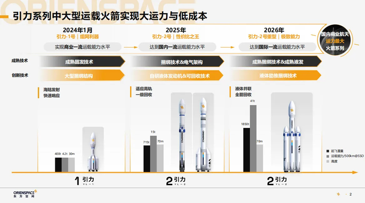 中科宇航火箭图谱 “引力一号”近地轨道运载能力6.5吨,是工信部《首台(套)重大技术装备推广应用指导目录(2024年版)》认定的中型运载火箭标准的民商火箭。比起目前国内主流火箭,发射成本已降低30-40%。 “引力二号”大型液氧煤油火箭已完成方案设计,预计2025年底具备首飞条件,具有运载能力大、性价比高等特点。相比“引力一号”,“引力二号”的运载能力进一步提高至15吨(500千米太阳同步轨道),可携带30颗500公斤重的卫星上天,同时将成本进一步降低至SpaceX水平,每公斤载荷低至2万元。 东方空间:标准化设计,造火箭就像拼积木一样 |
