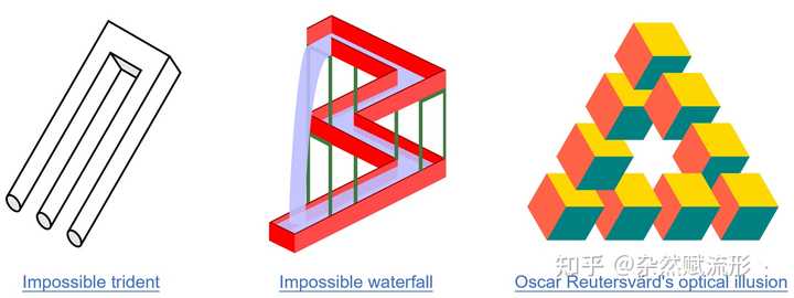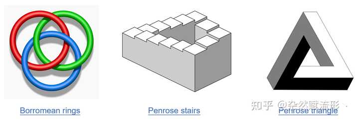 《纪念碑谷》里的游戏地图(中、右),很明显在致敬埃舍尔 1961 年的作品《瀑布》(左) 从直觉上来说,这些不可能图形的不可能性是相当「显然」的。但数学毕竟不是语文,又该如何严谨地证明它们的「不可能性」呢。 这部分内容我在另一个回答里详细论述了证明方法,在此便不重复了,感兴趣的可以移步以下回答: 例如:彭罗斯三角形我们处理的对象是上同调群 H^1(X,\mathbb{R}^+) 、彭罗斯阶梯我们处理的对象是上同调群 H^{1}(X,\mathbb{Z}_2) 。 另一方面,对于 Borromeo 链环的不可能性证明也非常有趣,即: Borromeo 链环不可能由三个刚性的正圆构成。 最早是 Freedman 和 Skora 在1987 年的一篇文章里给出的证明[2],尽管其中的几何直觉非常优雅,但解释起来却相对冗长,这部分内容的通俗解释可以参见《数学天书中的证明》第十五章[3]。 |