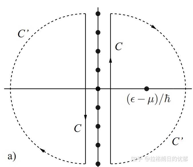 图来自Stoof的Ultracold Quantum Fields中的7.2图 这里的回路 C 是绕着虚轴的,然后只需要证明上面式子的左边等于费米/玻色分布就可以了。 接着只需要在回路 C 的外边接一个无穷大但是不包括虚轴的回路 C' ,两个回路加起来就是绕着无穷远做一个回路积分,很明显能看出来 \frac{e^{\eta z}}{z-(\epsilon_k-\mu)}\frac{\mp 1}{e^{\beta z}\pm 1} 这玩意儿在无穷远处贡献是0,所以俩回路积分加起来等于0。而绕着 C' 的回路积分只有一个pole,就是 z=\epsilon_k-\mu ,再次对 C' 的积分用一次留数定理,马上就得到 \lim_{\eta\rightarrow 0^+}\frac{1}{2\pi i}\int_C dz \frac{e^{\eta z}}{z-(\epsilon_k-\mu)}\frac{\mp 1}{e^{\beta z}\pm 1}= \pm\frac{1}{e^{\beta(\epsilon_k-\mu)}\pm 1} 也就证完了。这种技巧在凝聚态场论里面属于最初级但是最实用的技巧,其巧妙地将求和转化为围道积分,进而用留数定理把求和解决掉,最终得到了一个费米/玻色分布的形式。 |