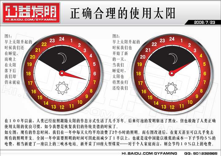 ?消费者在购买前可以选择不同的缓冲物以便契合自己的需求?,这些物品可长期保存,且为生活必须的长期消耗品,与其专门花时间专门购买,不如顺手而为。该方法尤其适合网店使用。如此一来既能达到足够的缓冲效果,亦节省了购买泡沫包装的费用,最后还能保护环境,一举多得,何乐不为? 结论: 实施者:淘宝等网络店铺、日用品制造业、卫生用品厂商等 可行性:自古以来 迫切度:★★★★★ 扩展阅读:http://blog.sina.com.cn/s/blog_9b2799df0102wjhw.html ---------------------------------------------------- 13 正确的使用太阳 在100年以前,人类已经按照跟随太阳的作息方式生活了几千万年。后来灯泡的发明驱逐了黑夜,但也赶跑了人类正确使用太阳的优良习惯,如果把我们的作息时间提前3小时——也就是早上4点起床,5点上班,上午10点午休,中午12点上班,4点下班,新闻联播5点开始……这样我们就保持了与太阳相同的作息时间,有如下优点: 1 早上与太阳一同起床,在自然的黑暗中可以保持更良好的睡眠。 2 与你屋檐下的燕雀屋里的猫狗保持了相同的作息时间,不会被早起的动物所打扰。 3 虽然冬天早上上班的路可能太冷了一些,但夏天却可享受凉爽的清晨。 4 10点钟午休,出去吃饭或回家都躲开了中午和下午的最高温时间。 5 可以在温和的阳光下吃晚饭而无需开灯——这是最重要的,全国一年中需要照明的时间大约减少了1半以上,也就是说中国能以极低的成本一下子节约5%的电费,相当新建了一座以上的三峡水电站。对于个人家庭而言,则会节约10%以上的电费。 |