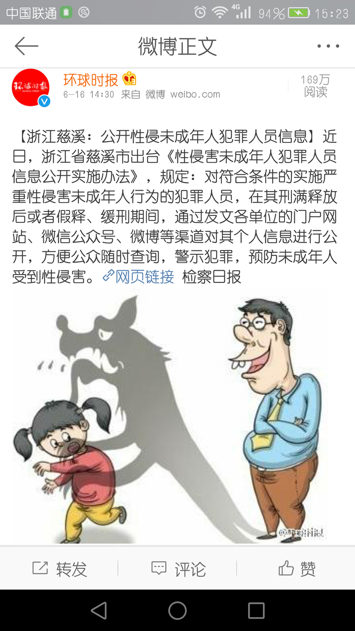 对性侵者、家暴者的联网查询、信息提供、社会限制和能落实到位的禁制令。 有的性侵孩子的罪犯出狱后继续应聘当老师。 董珊珊的丈夫把董珊珊虐待致死后坐了几年牢,出来又娶个老婆,继续家暴。有的跟家暴丈夫好不容易离婚了还不停被骚扰。 难道出台一些相关限制措施真的这么难吗? 这一点真的要好好向灯塔国学习。 评论有要求详细介绍美国的“梅根法”的,先贴个百度百科过来: http://baike.baidu.com/link?url=CcnBBuUJJYZKeyMGiA-YBIHw59IXDJXST10ww7aljpcB2PxBEV68YgTaIeHvmoOflbs-GcwOJitrZkV1ulCkY_ 简单介绍:1994年,一名7岁的美国小女孩梅根·坎卡(Megan )被住在她家附近的一名性犯罪分子绑架、并遭其奸杀。1996年5月17日, http://baike.baidu.com/view/19447.htm 总统签署了“梅根法案”(Megan‘s Law)。 将正式建档的性犯罪案件资料放到网上以供读取;且此等罪犯被释放后必给予以备案存档。 原文的这一段值得思考: 随着互联网的普及,各州纷纷把性罪犯的资料放在网上。老百姓可以随时查询自己居住的街区是否住着刑满释放的性罪犯。当然,这种做法无法完全杜绝性犯罪,但是,却可以在一定程度上减少性犯罪的危险。 梅根法案现在美国每个州都在执行,宽严不同。对于本法案是否侵犯性犯罪者的人权,存在一定争议,但目前的主流意见是利大于弊,所以仍然一直被执行。 ——————6.21更新—————— 前两天看到的新消息,浙江慈溪已经公开性侵未成年人的罪犯信息并提供查询,至于推行情况和成效,拭目以待吧。 |