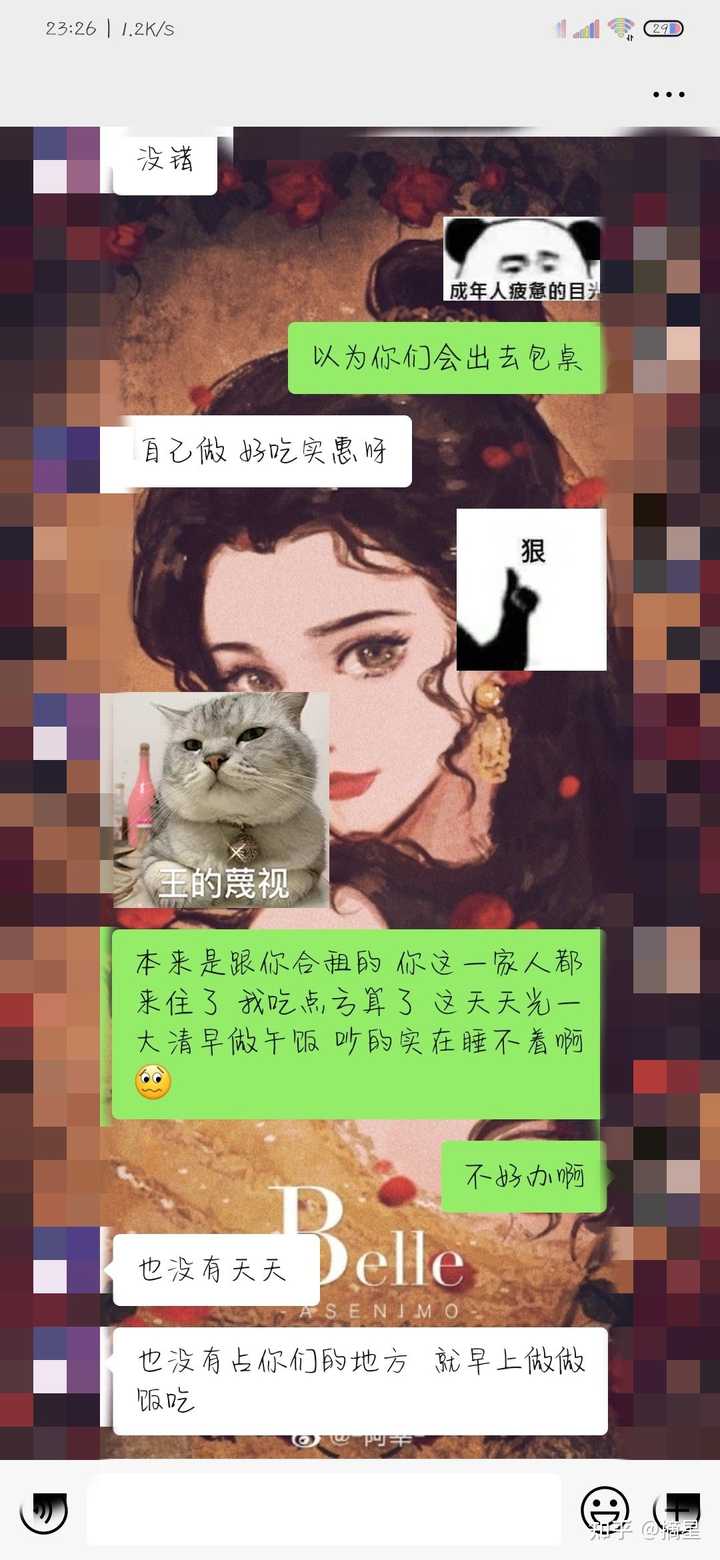 一开始我们以为,可能就是偶尔来一次,后来他们开始连着来,再get一个小芝士,他爹妈还带着朋友来聚会?可能因为我们这里冬天开了暖气比较暖和,他们就开始来聚会了?but不会尴尬吗,虽然是儿子,但是也是跟人合租,真的很影响我们休息 然后过年的时候,他们一家人都来了,我男朋友也回家过年了,就我一个人,我跟他们一家人,爸爸妈妈两个妹妹女朋友和他,一起过年〔因为害怕疫情回家回不来,所以我没有回老家跟男朋友或者家人一起过年,再者我还有只猫猫,有些担心〕 人傻了大概,我自己平时也会偶尔做饭,过年饭店大多数都关门了,我就提前买了菜,想着自己做饭吃,然后大年初一我打开冰箱,菜没了, 。。。。。啊没了??? 美女无语,他们一大家人买的菜肯定不少,还得用点我的。大过年有被无语到,后来他妈是这么给我说的,我看你的青椒坏掉了,我怕扔了可惜就给你用了,等改天买几个还给你 ??啊一两天就坏了,所以我的黄瓜和西红柿呢,就不提了? 这话好像在道德绑架我,给我整不会了,然后我说 好,那你改天还给我吧 |