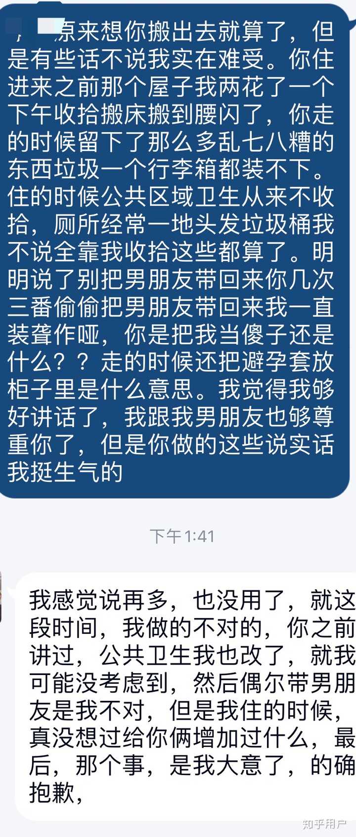 哦就扔了一袋厕所垃圾就叫改了,合租卫生恶心人偷带男朋友回来就叫没增加什么。懒得回她了,拉黑算了。 真的,别把人当的太善良。别把所有人都当有素质的人看。 11月11更, 还有人挑刺杠,我挺无语的… 首先我跟我男朋友住两年没想过租屋子,是她要备考先找我要租,没住进来之前我就跟她说了屋里有个男人她说无所谓,我觉得会影响她才给她开1/4的房租,出发点大半是出于情分并不是我为了钱。 还有说我跟我男朋友住为啥不让她带男朋友回来人家也是合租的有权利。这两个能一样嘛??她当初就说是为了学习这个屋子离图书馆近,没住进来之前就说不会带男朋友我才租给她。我男朋友掏了一半房租,平时各种照顾她,她男朋友是趁我不注意偷摸着进来留下一堆恶心的东西还让我收拾的这能一样??这种行为都有点偷鸡摸狗的意思了还把人当傻子。她能接受跟陌生男人住在一起但是我实在没法接受,不是觉得性行为有什么,就是实在接受不了我最放松的地方有个陌生的男人。你有生理需要,出校门两分钟就是宾馆,宾馆也不贵就六七十,我租房子给你是为了你考研不是让你背着我天天带男人回来当十块钱一天的炮房。一边觉得便宜先骗我住进来然后带男朋友回来这个操作我真的…… 还有说厕所我男朋友也会留下精华恶心她……我两都是用小袋子装起来扔自己屋垃圾桶第二天带走,不像她大剌剌就扔在厕所都能放几天快发酵了还等我收拾。 她恶心人的卫生和偷偷带男朋友这事说实话还真没让我多大火。我最火的是她退租给我屋子弄的乱七八糟。我作为二房东,出租前把屋子打扫好,那个屋子以前是给我看书的除了桌子什么都没有。是我两一下午一样一样家具搬进去擦干净打扫好的。她退租只给我留下一屋子垃圾两个月没扫过的地跟避孕套。大学生了连这点最基本的素质都没有吗??? 还有说人家没出生社会,是家里人宠的让我包容点。我就踏上社会了?我就不是家里人从小宠到大的小女孩了??我不也只比她大一岁住学校吗?我男朋友不也是跟我同岁嘛?我还不够包容她??还要我怎样?跟她住那么长时间说过的最重的话就是上面那个截图了,我有再跟她要什么实质性的补偿或者让她回来打扫再或者把她挂朋友圈让人骂嘛??她糟蹋的一塌糊涂不还是我当妈一样在后面收拾。我跟她说了卫生问题她半个月就扔了一袋厕所垃圾就理直气壮的跟我说她改了,我难不成去打她嘛??这要是在社会上有几个能招架得住这样的??我从头到尾都没跟认识她的人说过她一个不好,我觉得毕竟吵起来不好看让周围的人评头论足对我对她都有影响我还怕影响她考研。我也从来不是包子性格,我闺蜜一直奇怪我咋没直接给她行李扔出去让她走。这毕竟在学校,周围住都是老师,朋友圈都是抬头不见低头见的同学,我想要一份我的体面。 2021年1月9日更, 咋这两天突然这么多人看… 这个事已经过去了两个多月了,我都不计较了,就当是大学时期一个小插曲。 跟大家说一下新动态,我终于终于,拿到了梦想大学的offer,激动的失眠两天…男朋友想尽快经济独立开始找工作了,说等我留学回来要混的比我好…那个学妹自从上次删掉以后就没打听了,也希望她好好的吧。 |