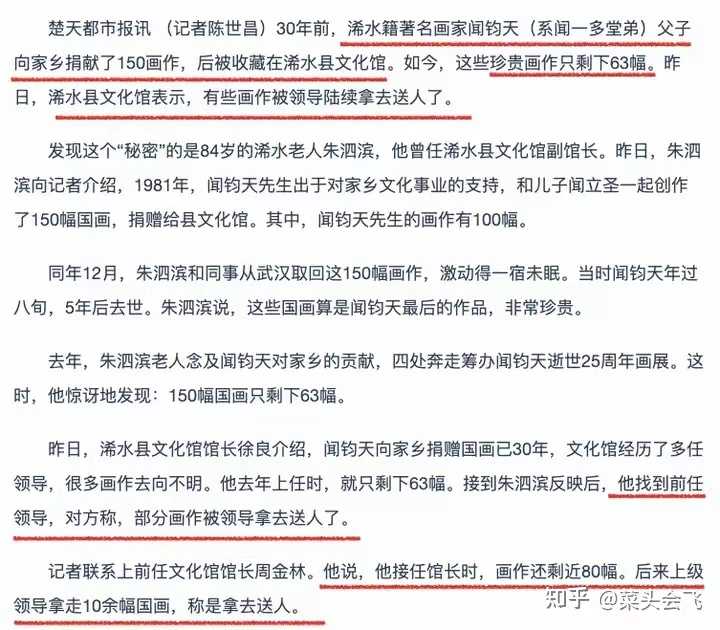 这种事情太正常了。 闻一多堂弟算是比较有名的画家,人家捐了一百多幅画给老家县文化馆,到了21世纪就剩60多幅了。 原因是被当地领导直接拿着送人了。 |