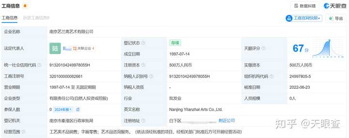 庞家还通过南博提供的报道调查发现,庞家人捐赠给南博的国家一级文物明代仇英《江南春》图卷是在上世纪九十年代被南京艺兰斋陆某、丁某某夫妇购得。2010年的报道显示,《江南春》图卷是南京艺兰斋美术馆的镇馆之宝。 天眼查官网显示,【南京艺兰斋艺术有限公司】的法定代表人正是陆某,经营范围包括工艺美术品销售等,参保人数为0人。 |