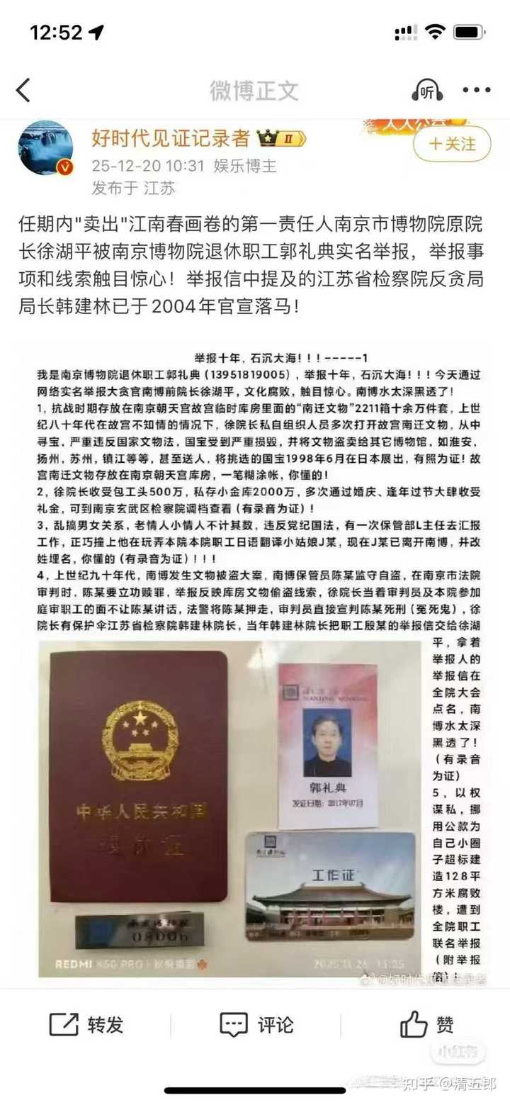 (12月19日更新新华社内容、21日更新举报内容) 目前我整理了网络上所有能看到的内容,截止今日应该是全网最全,不需要看其他资料了,网上能搜到的,基本全涵盖: 要了解这件事的始末,首先要了解下庞莱臣和其藏品、家族,以及和南京博物院的关系: 一、庞莱臣 庞莱臣(1864—1949) 原名庞元济,字莱臣,号虚斋,中国书画收藏家。其父庞云鏳为南浔四大富豪之一。家族资产约在600万两白银以上,他以书画收藏著称,藏有阎立本《进谏图》、韩幹《呈马图》、王维《春溪捕鱼图》,宋代赵佶《雪江归棹图》和《双鹤图》,元赵孟頫《秀石疏林图》、黄公望《富春大岭图》、倪瓒《渔庄秋露图》、唐寅《春山伴侣图轴》等历代名迹,被誉为全世界最富盛名的收藏家之一,为六大家之首,他的收藏书画数以千计,被王季迁称为全世界最大的中国书画收藏家,在收藏界与张伯驹并称为北张南庞。被誉为“收藏甲于东南”。编著有《虚斋名画录》、《虚斋名画续录》,从其藏品中选择历代精品634幅加以著录。庞元济的收藏主要进入上海博物馆、南京博物馆、苏州博物馆。 亲属关系: 夫人:贺明彤(继室 原配早逝) 【分得少部分藏品】 妻子表弟:郑山尊(1958年期间供职江苏省文化局) 弟弟:庞青城(同为收藏大家,孙中山当年主要支持者) 堂弟:庞赞臣 子辈:儿子 庞锡宝 31岁早逝 过继庞青城儿子庞维谨(即庞秉礼)为嗣子【分得1/3藏品】 孙辈:庞增和【分得1/3藏品】、庞增祥【分得1/3藏品】 曾孙辈:曾孙女庞叔令(庞增和之女,也作庞淑龄) 二、时间线:半个世纪的纠葛 (内容汇总相关资料) 1945年,庞青城去世, 1949年,庞莱臣去世,藏品大体分为四份,小部分由贺明彤作为公中(家族共有)掌管,嗣子庞维谨、两孙庞增和、庞增祥各分得三分之一,庞莱臣藏品开始逸散,其中嗣子庞维谨(即庞秉礼)及亲姐庞莲生还掌握部分庞青城“百柜楼”旧藏(《南浔庞氏》陆剑编,2009浙江人民 出版社《南浔丛书 第6辑》) 1953年,时任国家文物局局长郑振铎写给上海文管会会长徐森玉的信中,将《江南春》作为‘非要不可’的征集对象 |