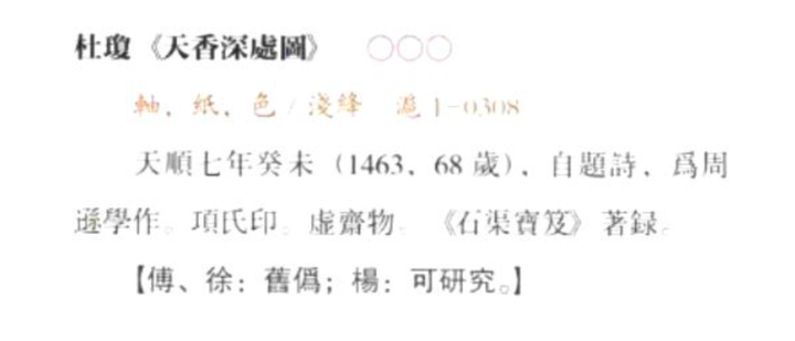 庞家后人所说的丢失的五件藏品,也就是南京博物院声明中被称为伪作的藏品“仇英《江南春》图卷、赵光辅《双马图轴》、王绂《松风萧寺图轴》、王时敏《仿北苑山水轴》、汤贻汾《设色山水轴》”,已经一件也没看到了。 所以,南京博物院所说的“上世纪90年代”,可以进一步精确到1986年之前。 至于南京博物院声明中所说的"我院依照《博物馆藏品管理办法》对该5幅画作进行了处置“,就更加搞笑了,别人捐的假画,就能随意处置吗? 我们拿上海博物馆作为对照组,其实上海博物也有虚斋的书画,好巧不巧,杨仁恺老先生去的时候还看到了,有一些被鉴定为“伪作”,但即使这样,这些书画依旧被完好保存,怎么滴,《博物馆藏品管理办法》只能管南京博物院,不能管上海博物馆? 例如这一幅《天香深处图》 |