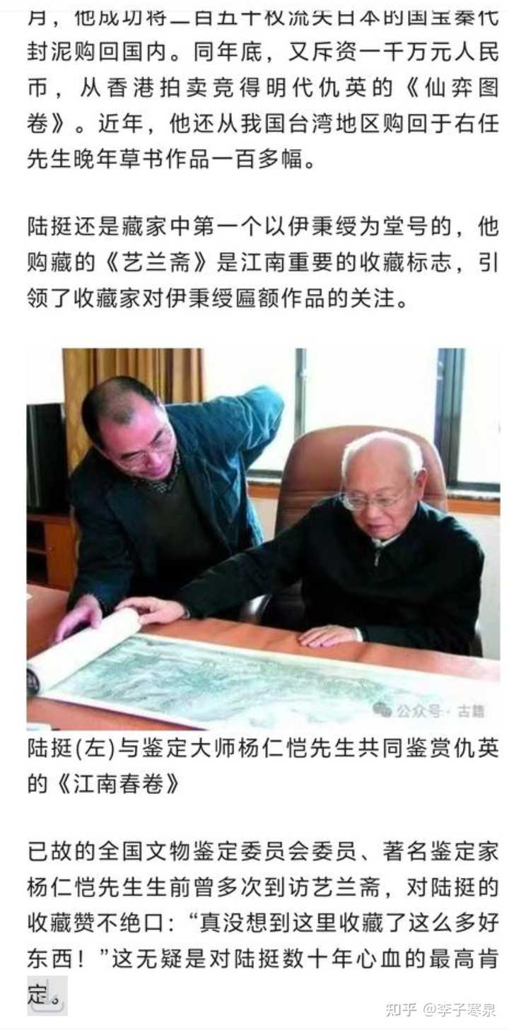 在1997~2008之间,陆挺邀请杨仁恺在艺兰斋观摩过仇英《江南春》卷。(2008年杨仁恺先生逝世,所以应该在2008之前在陆挺处观摩,资料显示应该在2006年期间) |