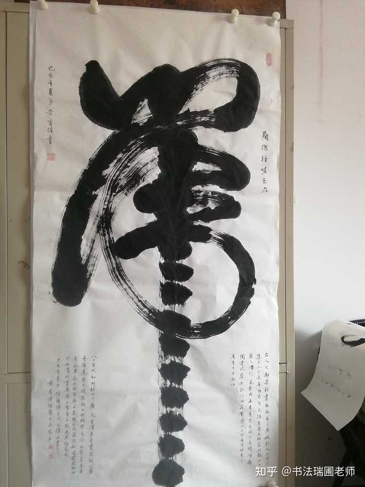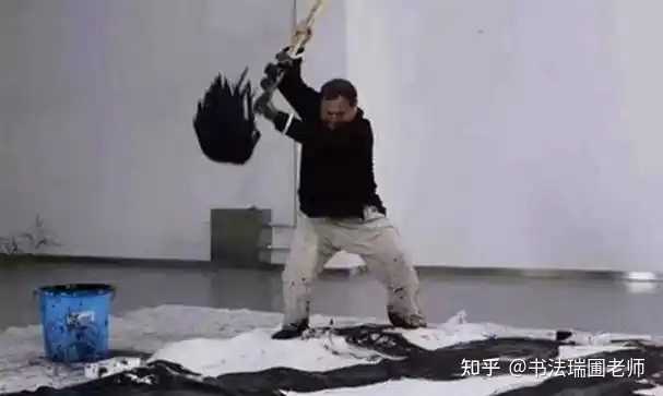 2、炫技式用笔与杂耍表演。这是江湖书法最显著的外在特征。书写者常常不使用正常的运笔方法,而是采用拖把、喷墨、注射器射墨、头发写字、手指蘸墨乱抹等非常规手段。 江湖书法@射书 |