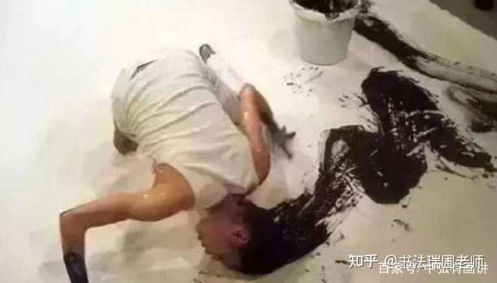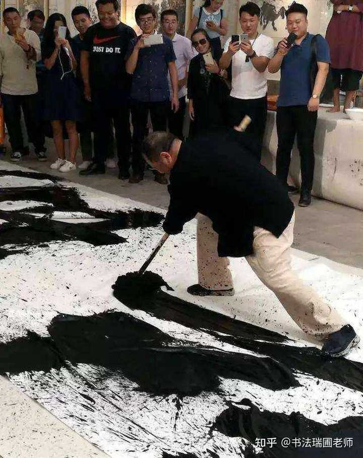 3、书写过程本身变成了一种“杂技表演”,如翻滚泼墨、大吼大叫,注重表演的戏剧性而非书写的内在功力。如代表人物:曾翔的“吼书”、邵岩的“射墨”等,虽然他们本人自称是“现代书法”或“艺术创作”,但其表现形式被广泛归类为江湖书法。 曾翔吼书 |