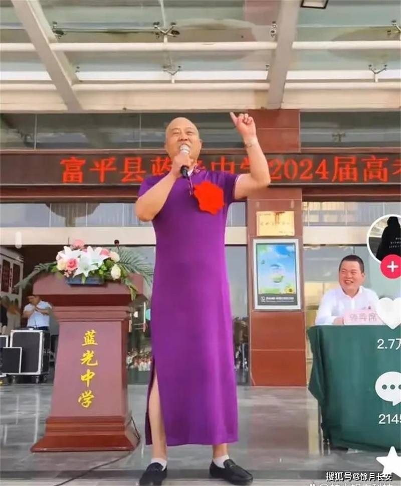 在陕西省富平县的一所高中里,近日发生了一件温馨而又特别的事情。该校一名男校长身着一袭紫色旗袍,出现在高三学生的面前,为他们即将到来的高考加油鼓劲。这一举动不仅让学生们感到惊喜和感动,也引起了社会各界的广泛关注。