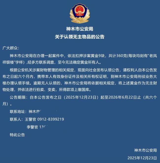 公告指出,根据公安机关涉案财物管理的相关规定,现面向社会发布认领公告。权利人需在公告发布之日起六个月内,携带有效身份证件及相关所有权证明到神木市公安局刑侦业务大楼办理认领手续。若逾期无人认领,神木市公安局将依据相关规定将上述黄金作为无主财物处理,并依法进行拍卖或变卖,所得款项上缴国库。 12月25日,神木警方一名官方人士表示,公告内容属实,但案件类型及具体涉案信息不便透露。公告发布后,不少人来电咨询这笔无主黄金,甚至有人试图冒领。其中一些人在凌晨两三点打电话给公告中的民警,对民警造成了一定影响。不过,认领者需要提供有效证件和证明,经过警方询问和调查确认后才能领走黄金。 按照近日金价,这笔无主黄金的价值约为40万元左右。 陕西恒达律师事务所高级合伙人赵良善律师表示,依据《公安机关办理刑事案件程序规定》第233条和《公安机关办理行政案件程序规定》第197条,对查封、扣押且原主不明的财物应发布认领公告,公告期限为六个月。因此,神木警方发布公告并告知期限与所需材料符合法定程序。 赵良善还指出,根据前述两条规定,公告六个月内无人认领的,按无主财物处理,拍卖或变卖后所得款项上缴国库;这也符合《罚没财物管理办法》中关于无人认领涉案财物参照罚没财物管理、所得上缴国库的要求。此外,冒领行为违法。以非法占有为目的虚构身份与所有权证明冒领,数额较大的涉嫌诈骗罪。一般咨询不违法,但多次恶意拨打、虚构信息、干扰办案秩序的行为属于扰乱单位秩序,可依据《治安管理处罚法》进行处罚。 (责任编辑:0882) (责任编辑:0882) 关闭