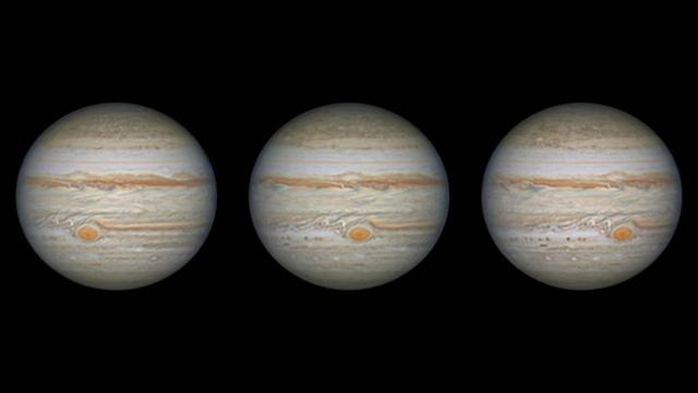 2022年9月27日木星冲日,这是9月26日在云南昆明拍摄的木星(拼版)。(梁长海 摄) 许长榕告诉记者,大红斑是木星上著名的反气旋风暴,已存在数百年,是其最显著的特征之一,常被视为木星的标志。 木星拥有众多卫星,其中四颗最大的卫星被称为伽利略卫星(木卫一、木卫二、木卫三和木卫四),它们围绕木星公转的周期从近2天到约17天不等。由于这些卫星公转周期差别很大,从地球上看起来,它们在木星两侧排列的队形总在变化着。 “有兴趣的公众通过小型天文望远镜观赏木星遮掩木卫一的同时,还可以试着找找其他三颗卫星。”许长榕提示说。