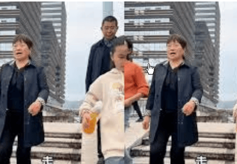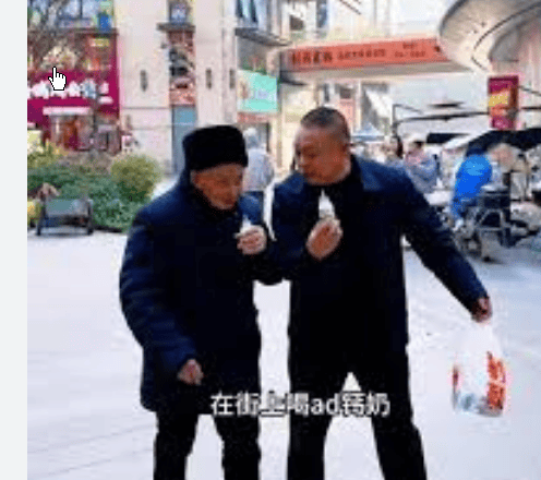 这段视频由一位女士拍摄。视频开头,这位女士介绍了现场情况,解释说她的50岁孙子和102岁的祖父正在街头喝添加了钙剂的钙奶,她的孙子即将中学毕业。