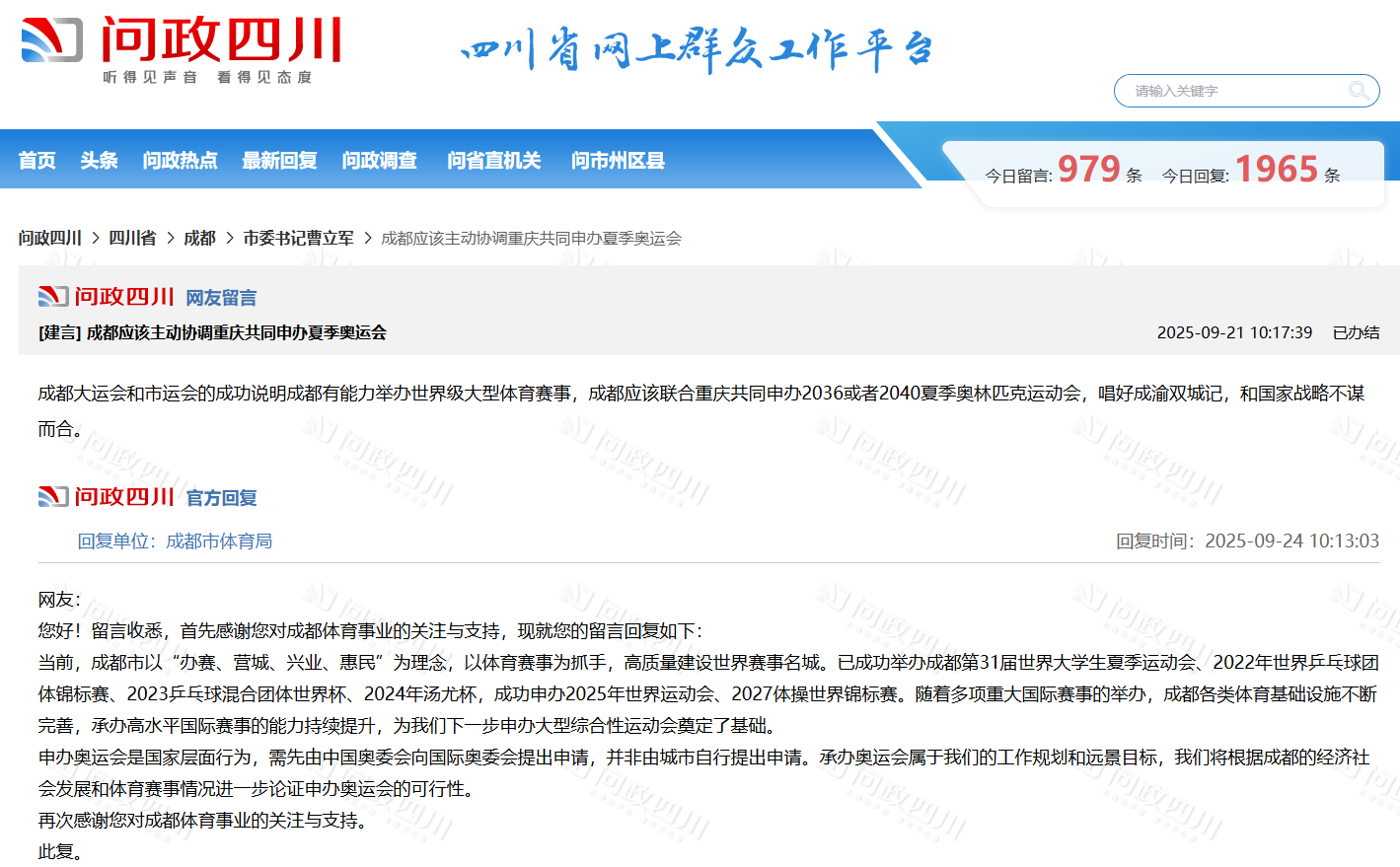 近日,有网发在问政四川平台留言,建议成都和重庆共同申办2036年或者2040年夏季奥运会。 对此,成都市体育局回复称,当前,成都市以“办赛、营城、兴业、惠民”为理念,以体育赛事为抓手,高质量建设世界赛事名城。已成功举办成都第31届世界大学生夏季运动会、2022年世界乒乓球团体锦标赛、2023乒乓球混合团体世界杯、2024年汤尤杯,成功申办2025年世界运动会、2027体操世界锦标赛。随着多项重大国际赛事的举办,成都各类体育基础设施不断完善,承办高水平国际赛事的能力持续提升,为我们下一步申办大型综合性运动会奠定了基础。 申办奥运会是国家层面行为,需先由中国奥委会向国际奥委会提出申请,并非由城市自行提出申请。承办奥运会属于我们的工作规划和远景目标,我们将根据成都的经济社会发展和体育赛事情况进一步论证申办奥运会的可行性。