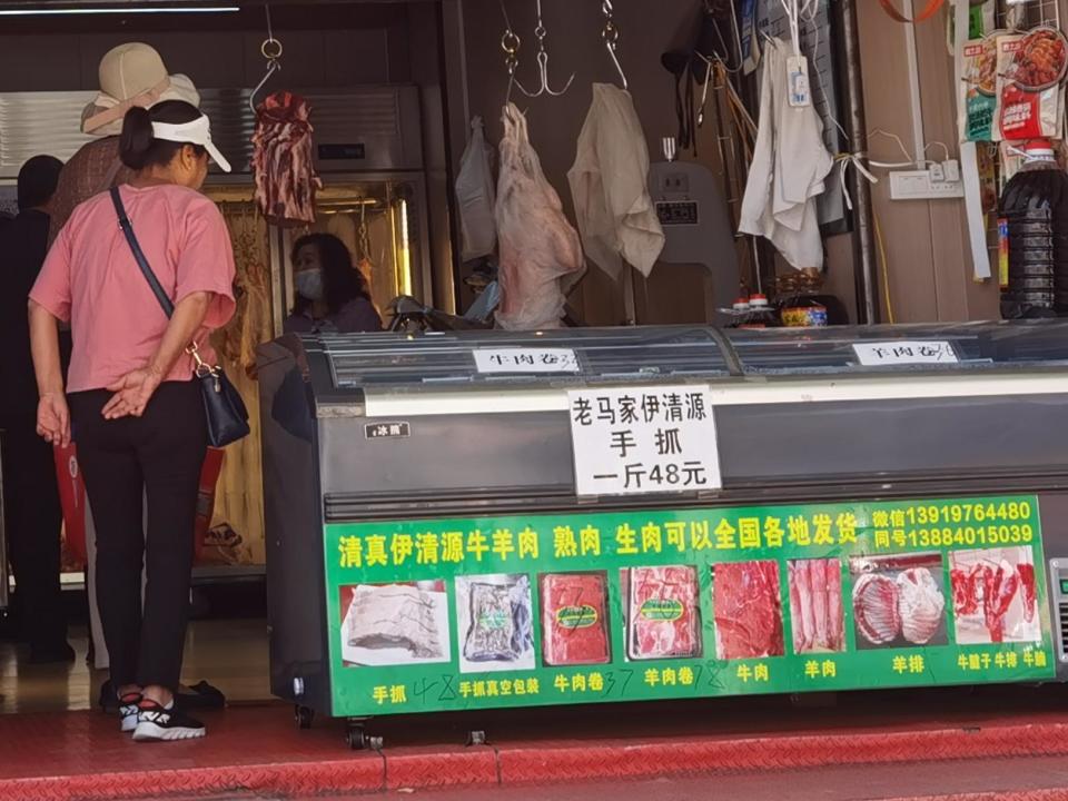 小店对市场的反应似乎更敏锐,这也体现在优惠力度上。在忠华家宴几百米开外的同一条街上,老马家伊清源牛羊肉店内,门口的招牌上写着“手抓一斤48元”,近年来一直以低价出圈的春台手抓近日价格是48元/斤,如此实惠的价格也吸引了许多人购买品尝。