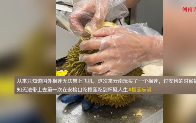 两人过机场安检10分钟狂炫7斤多榴莲。“这下后悔了吧!”9月20日,云南昆明,一男子来云南旅游买了一个大榴莲,返程时被告知榴莲不能带上飞机,他和女友在机场安检口10分钟狂炫140元榴莲,直呼对云南“榴莲”忘返,网友:估计放屁都是一股榴莲味!榴莲的味道香甜,口感软糯,可它却带着一股特殊的“臭”味,喜欢的人很喜欢,讨厌的人闻到这股味道恨不得跑得远远的。一男子和女友来云南旅游,返程时二人觉得当地的榴莲很好吃,商量买个榴莲带回去,男子在当地市场精挑细购买了一只140元的大榴莲。男子只知道国外的榴莲不能上飞机,不了解国内的情况,在过机场安检时,工作人员将他们拦下,告知榴莲不能上飞机,这可让两人傻了眼。登机时间很快就要到了,可140元不是一笔小数目,将榴莲直接扔掉或者送人又太可惜,无奈之下,两人在机场安检口将榴莲打开,硬着头皮捧起果肉就开始往嘴里炫,10分钟就将这个榴莲解决了。事后,男子表示当时吃榴莲吃到怀疑人生,感觉自己打嗝放屁都带着一股浓烈的榴莲味,这次真是吃“顶”了,估计短时间内对榴莲都提不起兴趣。榴莲虽好吃,但是吃多了难免也会腻,出门旅游返程时如果要带特产,一定要提前了解好飞机上什么能带什么不能带,不然就会像男子一样的下场!