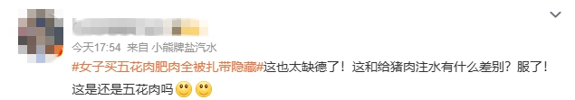 近日,四川广安一女子吐槽买回一块五花肉,准备给孩子做烤肉时,拆开肉上的软扎带,里面全是肥肉。