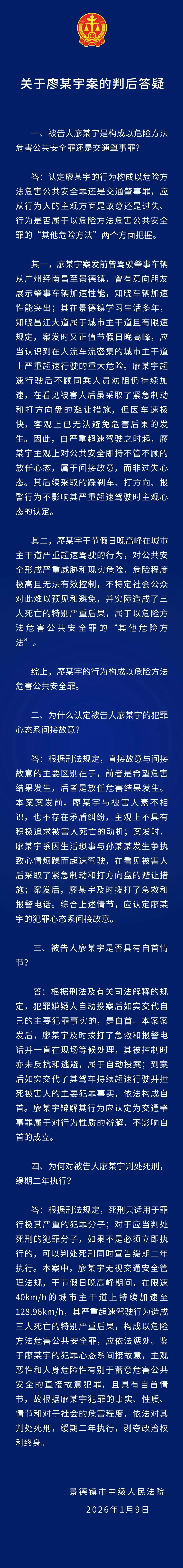 2026年1月9日,江西省景德镇市中级人民法院对被告人廖某宇以危险方法危害公共安全案一审公开宣判,对被告人廖某宇以以危险方法危害公共安全罪 判处死刑,缓期二年执行,剥夺政治权利终身。 景德镇市中级人民法院 关于廖某宇案的判后答疑 山西省高级人民法院版权所有,未经协议授权禁止下载使用或建立镜像 中国法院网负责网站设计制作 网络安全和技术维护 Copyright ? 2026 by www.chinacourt.cn All Rights Reserved. 浏 览 本 网 站 推 荐 您 使 用 IE 8 以 上 浏 览 器 |