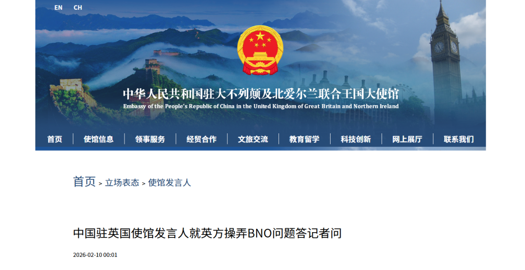 关注 2026-02-10 11:10 重庆 来源:澎湃新闻·澎湃号·媒体 字号 中国驻英国使馆发言人就英方操弄BNO问题答记者问 记者:2月9日,英内政部宣布,将放宽港人申请BNO签证的条件。请问中国大使馆对此有何评论? 使馆发言人:中方一贯坚决反对英方操弄BNO问题、干涉中国内政。 英方此前类似做法已导致一些受蛊惑的港人背井离乡,到英国后遭受歧视、生计窘迫,沦为“二等公民”。英方现在进一步玩弄BNO伎俩,其行可鄙,其心可诛。 我们敦促英方认清大势,停止政治操弄,停止干涉香港事务和中国内政,否则必将自取其辱、自食恶果! ![]() 原标题:《英方进一步玩弄BNO伎俩,我使馆:类似做法已导致受蛊惑港人抵英后遭受歧视,沦为“二等公民”,敦促英方停止干涉香港事务和中国内政》