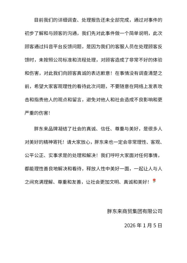 近日,有顾客在抖音平台上反馈称,在胖东来购买的茶叶中发现苍蝇。对此,胖东来迅速响应,成立了由集团轮值成员组成的专项调查小组,对事件进行了详细调查。公司承诺将在调查结果出来后,第一时间通过官方平台进行公示。 ![]() 为了确保商品品质,在调查结果公布前,胖东来已对该商品进行了下架处理。公司的品质管理部也立即前往生产厂家,对厂家资质、生产过程和检验检测等环节进行全面复核。此外,调查小组还对部门管理和员工售后服务全过程进行了全面调查,针对各环节出现的问题,将采取严格的处理及整改措施。 ![]() 目前,详细的调查和处理报告尚未完成。根据初步了解和与顾客的沟通,胖东来表示,此次事件中客服人员在处理顾客反馈时未按照公司标准和流程操作,给顾客带来了不愉快的体验和伤害。为此,胖东来向顾客表达了真诚的歉意。 (责任编辑:zhangxiaohua) (责任编辑:zhangxiaohua) 关闭![]() 广告 关闭广告 ![]() 广告 关闭广告 ![]() 广告 关闭广告 ![]() 广告 关闭广告 deep电脑版R1满血版-本地部署到桌面 |