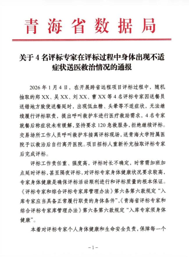近日,青海省数据局在青海省公共资源交易网发布了一则通报,涉及4名评标专家在评标过程中身体出现不适症状送医救治的情况。