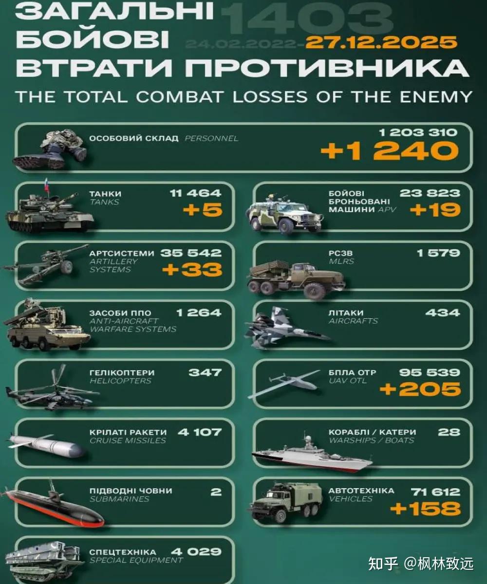 他说,“胡里亚波尔市本身的情况相当艰难。敌军继续发动攻击,试图将乌军赶出城市。街头战斗仍在继续,我们每天都记录到胡里亚波尔直接发生的二三十场战斗。”他指出,“俄军试图布置防御工事,并让他们坚守某些阵地。乌军正在阻挡敌军推进,并对这些俄军小组进行火力打击。” 该发言人称,“敌人正积极攻击沿着第聂伯罗彼得罗夫斯克州-波克罗夫斯克方向通往胡里亚波尔的后勤路线上的定居点。多布罗皮利亚、普里卢基和瓦尔瓦里夫卡等定居点仍在继续战斗。” 他表示,敌方还利用滑翔炸弹对胡里亚波尔及附近定居点实施空袭。“形势相当棘手,我们不会隐瞒。发言人强调,仅过去一天,就录下了二十多场战斗交火。冲突数量最多的正好发生在胡里亚波尔地区,尽管前线的其他部分也仍在交战。” 发言人解释说,俄军的主要目标是夺取胡里亚波尔。“这是该地区最大的定居点,也是重要的交通枢纽。夺取胡里艾波尔后,敌军可以作为后勤支点,然后继续向前推进。”目前乌军高层已经派出精锐部队前往这个方向增援。整体而言,战局跟之前相比并没有明显变化。 9、【乌总参谋部公布的俄军最新战损统计】俄乌战争全面爆发第1403天,过去24小时内俄军伤亡1240人,其他战损如下图(黄色数字为过去24小时统计数量,白色数字是累计总额)。 ![]() |