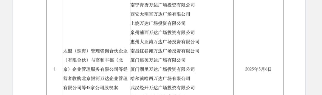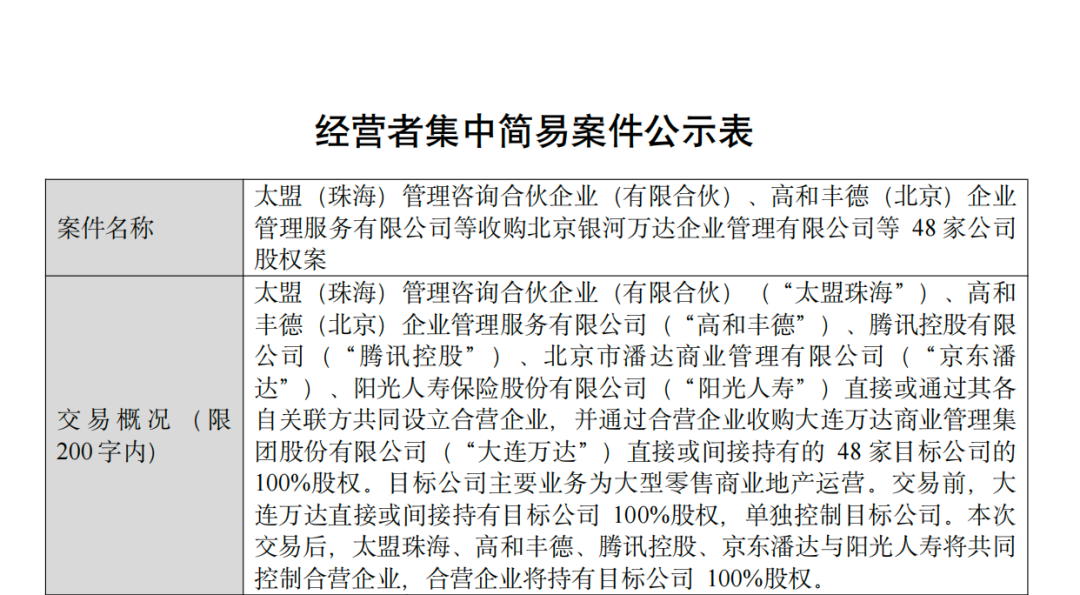 ![]() 王健林再卖48家万达广场! 5月20日,国家市场监督管理总局发布的无条件批准经营者集中案件列表显示,5月6日,太盟(珠海)管理咨询合伙企业(有限合伙)、高和丰德(北京)企业管理服务有限公司等收购北京银河万达企业管理有限公司等48家公司股权案获批。 ![]() ![]() 5家公司获准收购48座万达广场 具体来看,收购方共有5家:太盟(珠海)管理咨询合伙企业(有限合伙)(以下简称太盟珠海)、高和丰德(北京)企业管理服务有限公司(以下简称高和丰德)、腾讯控股有限公司(以下简称腾讯控股)、北京市潘达商业管理有限公司(以下简称京东潘达)、阳光人寿保险股份有限公司(以下简称阳光人寿)。 前述五家公司直接或通过其各自关联方共同设立合营企业,并通过合营企业收购大连万达商业管理集团股份有限公司(以下简称大连万达)直接或间接持有的48家目标公司的100%股权。 目标公司主要业务为大型零售商业地产运营。交易前,大连万达直接或间接持有目标公司100%股权,单独控制目标公司。本次交易后,太盟珠海、高和丰德、腾讯控股、京东潘达与阳光人寿将共同控制合营企业,合营企业将持有目标公司100%股权。 ![]() 48家目标公司均为万达广场项目,分布在北京、上海、广州、合肥、重庆、天津、武汉等共40个城市,包括北京万达广场企业管理有限公司、上海颛桥万达广场投资有限公司、广州万达广场投资有限公司、合肥天鹅湖万达广场投资有限公司等。 被执行总额超75亿元 近年来,为了缓解债务压力,万达集团开始向轻资产模式转型。多家公司也相继出手,近两年时间合计接盘买入近20个万达广场项目。 天眼查信息显示,今年以来,坤华(天津)股权投资合伙企业(有限合伙)相继收购了位于铜陵、宣城、安阳、四平、扬州的5座万达广场。而在前述交易实施完毕后,年内被卖出的万达广场将超过50座。 连续出售多个万达广场项目后,今年4月,万达酒店发展发布公告称,已与同程旅行等签订买卖协议,拟以24.97亿元的价格向其出售万达酒管100%股权。此次交易预期所获款项净额为24亿港元,将以股息的方式向股东分派全部或大部分所得款项。 尽管如此,大连万达集团获得的回笼资金仍难以填补债务窟窿。天眼查信息显示,今年以来,大连万达集团又新增多条股权冻结信息、被执行人信息。截至目前,其被执行总金额已超75亿元。 ![]() 编辑:何瑞敏 责编:吴俊 审核:金飞芬 海量资讯、精准解读,尽在新浪财经APP |