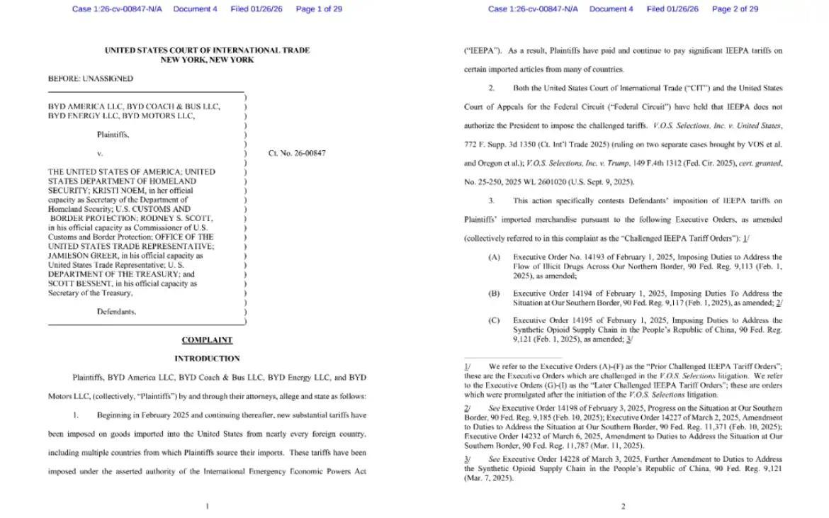2026年1月26日,比亚迪(BYD)旗下的四家美国关联公司向美国国际贸易法院(U.S. Court of International Trade, CIT)正式提起诉讼,对美国联邦政府依据《国际紧急经济权力法》(IEEPA)实施的一系列关税行政令提出法律挑战。美国国际贸易法院于2月2日披露此项诉讼信息。