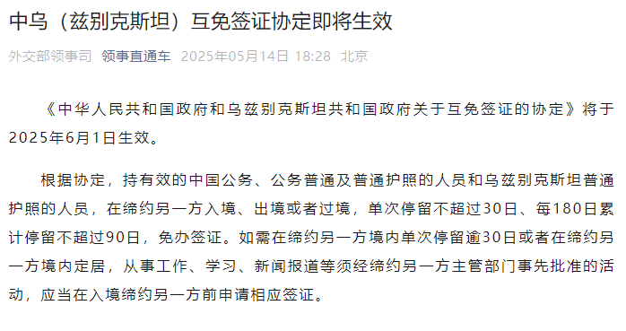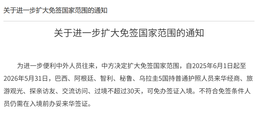 2025年05月30日 08:01 广东 为进一步便利中外人员往来,中方决定扩大免签国家范围! 自2025年6月1日起至2026年5月31日, 巴西、阿根廷、智利、秘鲁、乌拉圭 5国持普通护照人员来华经商、旅游观光、探亲访友、交流访问、过境不超过30天, 可免办签证入境。 不符合免签条件人员仍需在入境前办妥来华签证。 (图源:外交部官网) 外交部发言人林剑对此指出:中方将坚持高水平对外开放,出台更多措施,不断提升中外人员往来便利化的水平。 也欢迎更多外国朋友们用好来华免签和签证便利化政策,多到中国走一走,看一看,体验多彩绚烂、热情活力的中国。 |