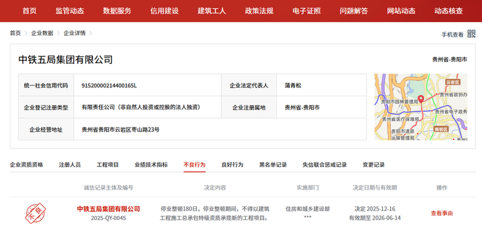 中铁五局被住房和城乡建设部实施停业整顿180日 |