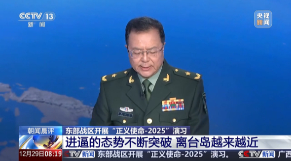 今天,东部战区新闻发言人施毅陆军大校表示,12月29日开始,中国人民解放军东部战区组织陆军、海军、空军、火箭军等兵力,位台湾海峡、台岛北部、台岛西南、台岛东南、台岛以东,组织“正义使命-2025”演习,重点演练海空战备警巡、夺取综合制权、要港要域封控、外线立体慑阻等科目,舰机多向抵近台岛,诸军兵种联合突击,旨在检验战区部队联合作战实战能力。这是对“台独”分裂势力和外部干涉势力的严重警告,是捍卫国家主权、维护国家统一的正当必要行动。