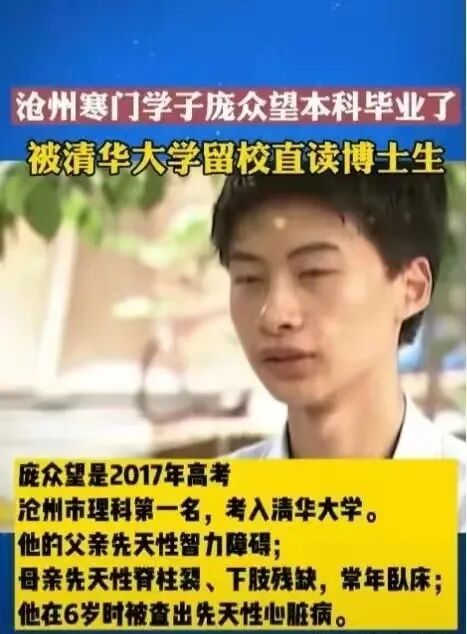 授权转载自说姐看世界 (ID:shuojiekanshijie) 一年一度的高考落下帷幕,每到这时,人们总忆起不少和高考有关的事情。这不,曾经的高考状元庞众望,他的名字最近大量出现在社交媒体上,从抖音到公众号,再到知乎,到处都能见到他的身影。站在当下回望这位河北农村男孩的故事,依旧感到无比震撼和感动。庞众望,父亲是一位精神分裂症患者,母亲先天残疾,常年卧病在床,自己6岁时还被查出先天性心脏病,母亲坐着轮椅四处为他借钱做手术,才拥有了健康的身体正常学习。2017年,他顺利通过清华大学的“自强计划”招生测试,获得该校60分(最高)的优惠加分,并最终以684分(加分后744分)成为河北省吴桥县理科状元,顺利进入清华读书。当年,清华校长亲自去到他家,却被眼前的情景深深触动。 破败的、陈旧的房屋、瘫痪的母亲、智力低下的父亲, 他都不敢相信,如此陋室真能跃出龙门贵子。然而被苦难和辛劳笼罩的环境,却意外浇灌了庞众望积极乐观的处事态度,他自信从容,荣辱不惊,一双清澈的眼包含星辰辽阔。在接受媒体采访时,他坦坦荡荡地表示:“大家没有必要资助我。从这样的家庭成长起来,我知道,每个人赚钱都不容易。我们自己能过得下去,为什么要欠别人的人情。人情这种东西不怎么好还。”5年后的今天,这位曾经感动全中国的寒门贵子庞众望,已于去年本科毕业,并直升清华大学博士。但遗憾的是,那个给他无限力量,一直相依为命的母亲,因病于儿子本科毕业前一年去世,但于庞众望而言,母亲坚强不屈的生活态度早已刻入生命,他会好好完成博士学业,回报母亲这些年来的付出和帮助。 在青少年抑郁比例高居不下的今天,在焦虑重重的育儿环境下,庞众望的故事总能给予人们不一样的角度,去看待育儿、看待人才的培养。除了钱,教育中最重要的到底是什么? 庞众望母亲自幼与病痛相伴,双腿截肢,生活难以自理;父亲是一位精神分裂症患者,只能在清醒时做些简单的零工,偶尔回家,一家人的生活异常窘迫。毫无疑问,这是个艰难而无奈的婚姻组合,充满了病痛的折磨和生活的压力。直到1999年2月8日,众望出生,带给了这个家庭全新的希望。母亲庞志芹告诉记者:“我没读过一天书,但我羡慕你们读书人。我和孩子的爸爸都不行,所以就把全部希望寄托在众望身上。这个家庭,不能不努力。”在庞众望的记忆中,他很少有新衣服,没去过游乐场,连早餐的鸡蛋都要母子之间相互谦让。在其他小朋友蹦蹦跳跳、四处玩闹时,6岁的庞众望已经意识到,他必须要为这个家做点什么。小小的众望学着将垃圾、塑料瓶、纸板都捡回到家里,但毕竟年纪小,体力有限,忙活大半天有时捡回的废品只能卖几毛钱,但这也足够令庞志芹感动得痛哭流涕了。面对这样的家庭环境,庞众望从不怨天尤人,相反,他感到非常非常知足。在他的河北老家,有许多同学的父母亲都在外地打工,一年能见上父母亲最多一面。 但小众望每天都能见到妈妈,嬉戏玩闹、相互陪伴,这给了他很多安全感。 妈妈的乐观,给了众望极大的影响,这个从出生开始就不被命运垂青的女人,靠着意志活出了自己的色彩。众望妈妈很爱笑,好像苦难带给她的,她都留在心里,面向别人的永远都是微笑。在《面对面》节目中,妈妈笑得乐开了花,她说: “自己会坚强些,不能在儿子面前表现得脆弱。” 行胜于言,妈妈的行动更是无声地影响着众望。也因此,在接受媒体采访时,庞众望说——“我觉得我的家庭没什么拿不出手的,没有哪一点不值得去讨论的。我妈妈那么好,我姥姥姥爷那么好,我的每一个家人都那么好。我觉得他们应该羡慕我的家庭。”然而天有不测风云,6岁那年,众望被查出患有严重的先天性心脏病,急需大额医疗费。4万块的手术费,压垮了这个本来就脆弱不堪的家庭。为了儿子,庞志琴坐着轮椅,挨家挨户借钱,求遍了村里的20多户人家。后来,小众望的病情终于被治愈,可庞大的债务却压在了羸弱不堪的母亲身上。她接了一些针线活,日夜缝制,父亲则被亲戚带着外出打工,共同偿还债务。有时候,在逼仄的苦难之中,更能尝到辽阔的幸福。那一刻,众望慢慢领悟到自家与他人的不同,也是在那一刻,他明白了眼前的妈妈对自己深沉绵长细腻的爱。