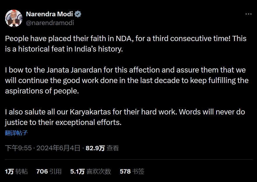 莫迪在社交媒体X上宣布胜选