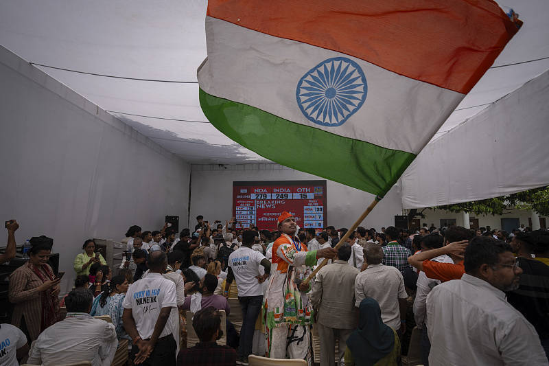 印度大选计票工作开启(视觉中国) 4日计票数据陆续公布期间,印人党及全国民主联盟获得的席位低于此前乐观预期,仅以微弱优势领先,一度引发投资者的担忧,导致昨日创下历史新高的印度股市突然出现了大幅逆转,创下四年来最大跌幅。据《纽约时报》称,基准股指已下跌8%,“几乎抹去了今年的所有涨幅”。 综合路透社报道,?印度所有行业股指均受影响,国营企业受到的冲击最为严重。银行股下跌7.8%,房地产股下跌9.1%,基础设施股下跌10.5%,石油和天然气股下跌11.7%。 在大选前夕,莫迪曾设定了一个雄心勃勃的目标:印人党要在议会拿下370个席位,全国民主联盟今年拿到超过400个席位。2019年,全国民主联盟赢得了353个席位,其中人民党占303席。 但在计票工作进行几个小时后,与出口民调预测的莫迪所在执政联盟将取得压倒性胜利相比,实际选情似乎要紧张得多。印人党联盟拿到290个席位,由国大党领导的反对派联盟印度国家发展包容性联盟(INDIA)则拿到220个席位,高于预期的125至182个席位。 “公平地说,400席目前看来肯定遥遥无期。”印人党发言人纳林·科利(Nalin Kohli)当时对“今日印度”坦言,“但我们需要等待……以了解席位的最终情况,因为出口民调显示会出现大规模横扫,(而)目前的计票趋势似乎与此不符。” 虽然莫迪获得连任,但他在议会中的多数党地位将“岌岌可危”,这也为莫迪第三任期的执政带来不确定性。莫迪可能需要寻求诸如泰卢固之乡党(Telugu Desam Party)等地方政党、或较小党派的支持,组建联合政府。 若最终情况真是如此,这将是莫迪政治生涯中第一次领导一个没有绝对多数席位的政府。而这个选择也将考验莫迪,因为泰卢固之乡党并不赞成印人党主张的印度教优先议程。