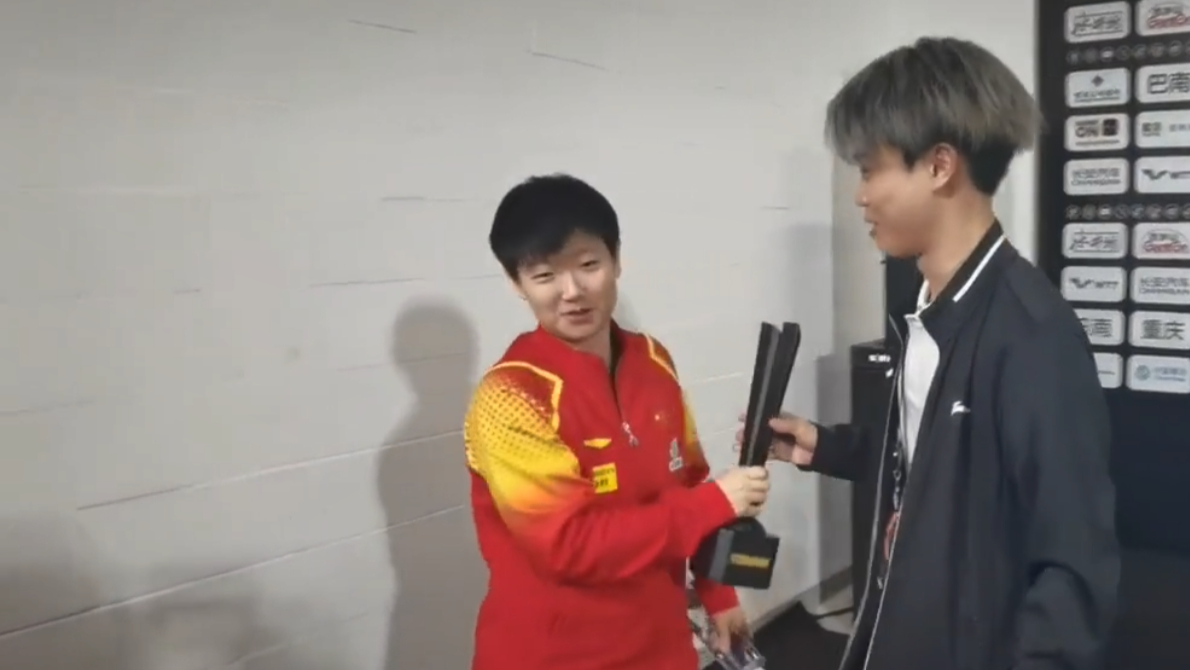 太可爱!赛后发布会,孙颖莎拿着一瓶水把奖杯丢了,樊振东乐坏了