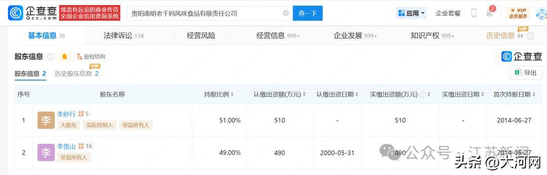 企查查 APP显示,老干妈关联公司贵阳南明老干妈风味食品有限责任公司成立于1997年10月,法定代表人为老干妈创始人陶华碧,注册资本1000万元,由陶华碧之子李妙行、李贵山共同 持股 。