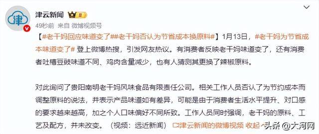 据津云新闻,1月13日,“老干妈为节省成本味道变了”登上微博热搜,引发网友热议。有消费者反映老干妈味道变了,还有消费者吐槽豆豉味道不同、鸡肉含量减少,也有人猜测其更换了辣椒原料。